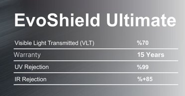 EvoShield Ultimate cam filmi, araç camlarında maksimum koruma, konfor ve estetik sağlamak için geliştirilmiş premium bir cam filmi çözümüdür. Gelişmiş teknolojisi sayesinde zararlı UV ışınlarını engeller, araç içi sıcaklığı düşürür ve sürüş konforunu artırır.